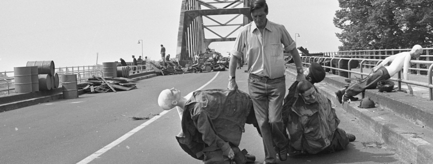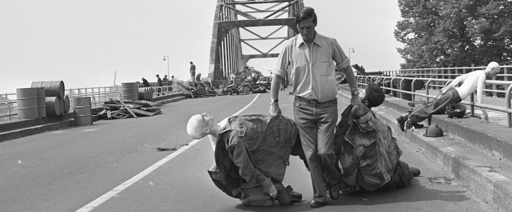 Lights, Camera, Action! Duitse officieren stappen in stilte in hun voertuigen aan de zuidkant van de Rijn. John Frost wordt gewaarschuwd en snelt naar buiten naar een beschutte plek met zicht op de Rijnbrug. De Duitse voertuigen rijden langzaam de brug op. Iedereen wacht in spanning af. Dan begint het vuurgevecht. Net als toen.