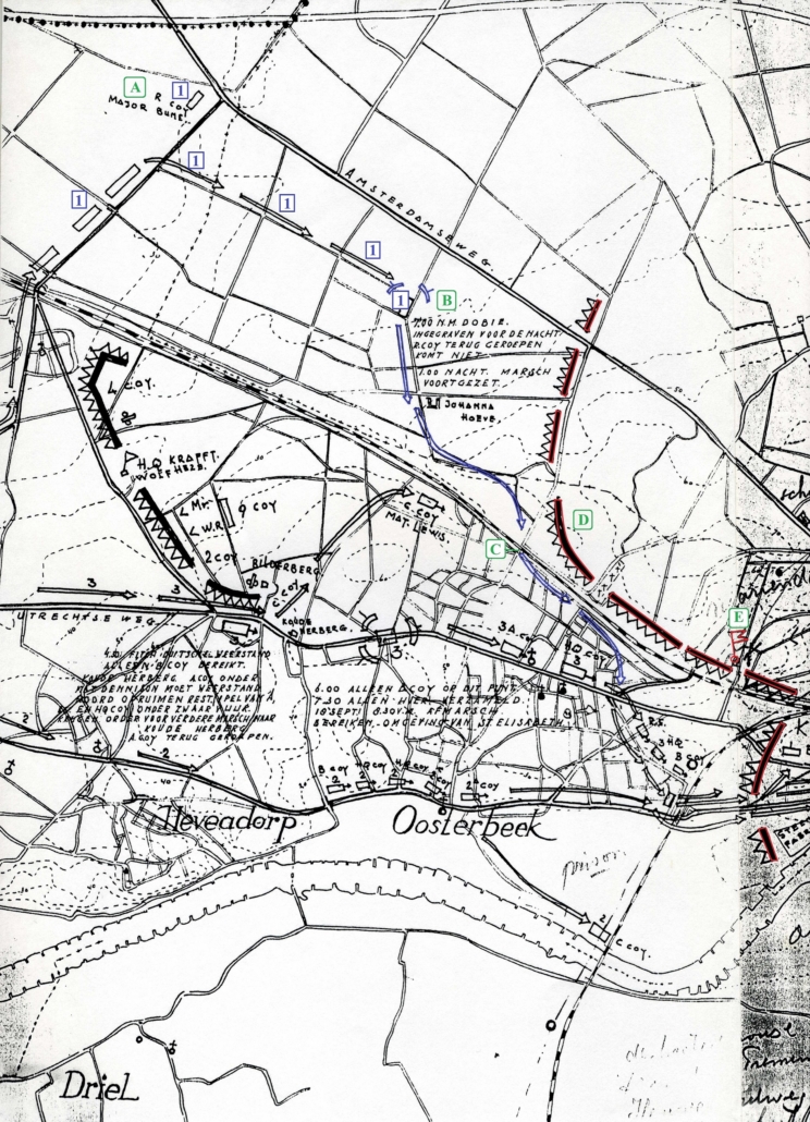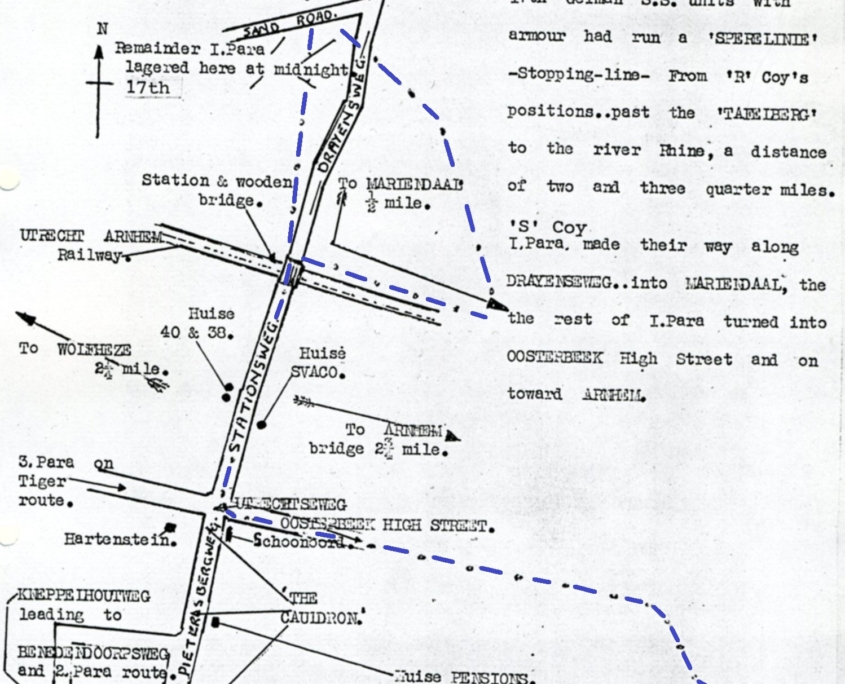 NOTE: It is evident from this that the 3rd Parachute Battalion cannot have had an Observation Posts or Standing Patrols up by the crossroads of the Utrechtseweg/Stationsweg on the night of the 17th/18th September, or they would have ‘linked up’ with the 1st Battalion. It would appear that ‘B’ Company were up around the Hartenstein, with Battalion Main to the West of them, and ‘A’ Company bringing up the rear, just to the East of the De Herberg cross-roads, all of the Battalion being either side of the Utrechtseweg.