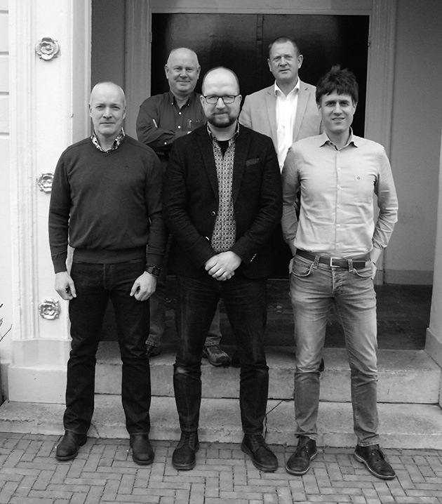 Het bij de ALV aanwezige deel van het bestuur van de vereniging op de trappen van de Concertzaal. VLNR: Herman van Ingen (penningmeester), Erik Jellema (activiteiten), Jasper Oorthuys (secretaris), Otto van Wiggen (voorzitter) en Alexander Heus- schen (hoofdredactie blad) (foto: Eugène Wijnhoud).