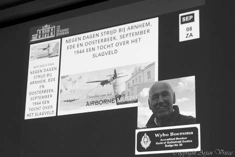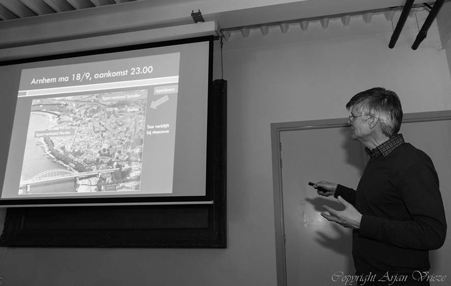 Tot op het stuk nauwkeurig, en ondersteund met overzichtelijke schetsen en een grote hoeveelheid authentieke foto’s, stond Eugene stil bij de volgtijdelijke fasen van de slag om Arnhem. Eugène nam de toehoorders eerst mee naar de verrichtingen van de aan 2nd Parachute Battalion gekoppelde B Troop die rond de noordelijke oprit van de Arnhemse brug stellingen hadden betrokken. Daarna volgde de inzet in de wijk Lombok in Arn-hem-West op maandag en dinsdag 18/19 september. Als laatste kwam de strijd aan bod in en rond de perimeter van Oosterbeek van 20 tot en met 25 september.