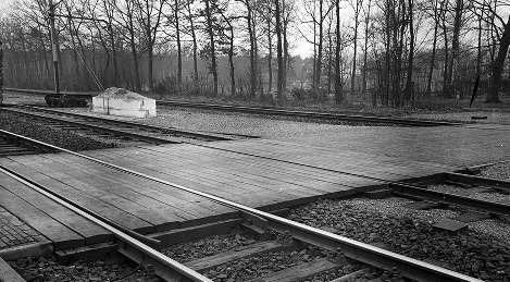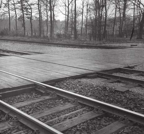 Zo ongeveer moet de plek hebben uitgezien waar 1st Parachute Battalion in de nacht van 17-18 september 1944 het spoor Utrecht-Arnhem overstak naar het zui- den, om zijn opmars te vervolgen richting Arnhem. Af- gebeeld is de eikenhouten overwegbeplating bij station Wolfheze, een markant punt uit de slag om Arnhem. De lorrie-uitzet, zoals beschreven in Ministory 130 op bladzijden 11-15, was smaller, maar had waarschijn- lijk dezelfde kenmerken (foto: Het Utrechts Archief, nr. 836116. Opnamedatum: 6 februari 1954, W. van Schaik, fotograaf Nederlandse Spoorwegen).