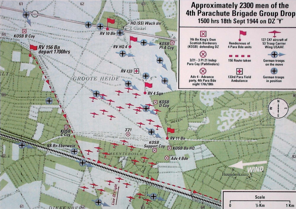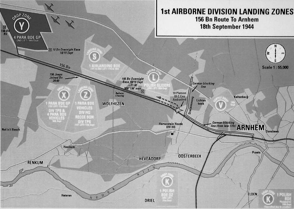 1st Parachute Bn. landde in de middag van 17 sep- tember 1944 op landingszone X en verzamelde zich rond de Jonkershoeve op de Renkumse Heide. Het bataljon was versterkt met A Troop van de 1st Airlan- ding Anti-Tank Battery RA (6 pdr), een sectie van D Troop van de 1st Airlanding Anti-Tank Battery RA (17 pdr), een Recce Detachement uit het 1st Parachu- te Squadron RE en no. 1 section van de 16 Parachute Field Ambulance.2
