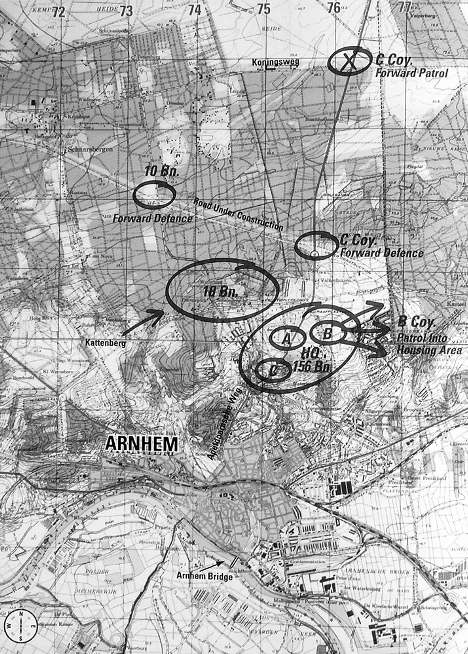 De stukken van B Troop bij de noordelijke brugoprit in Arnhem.
