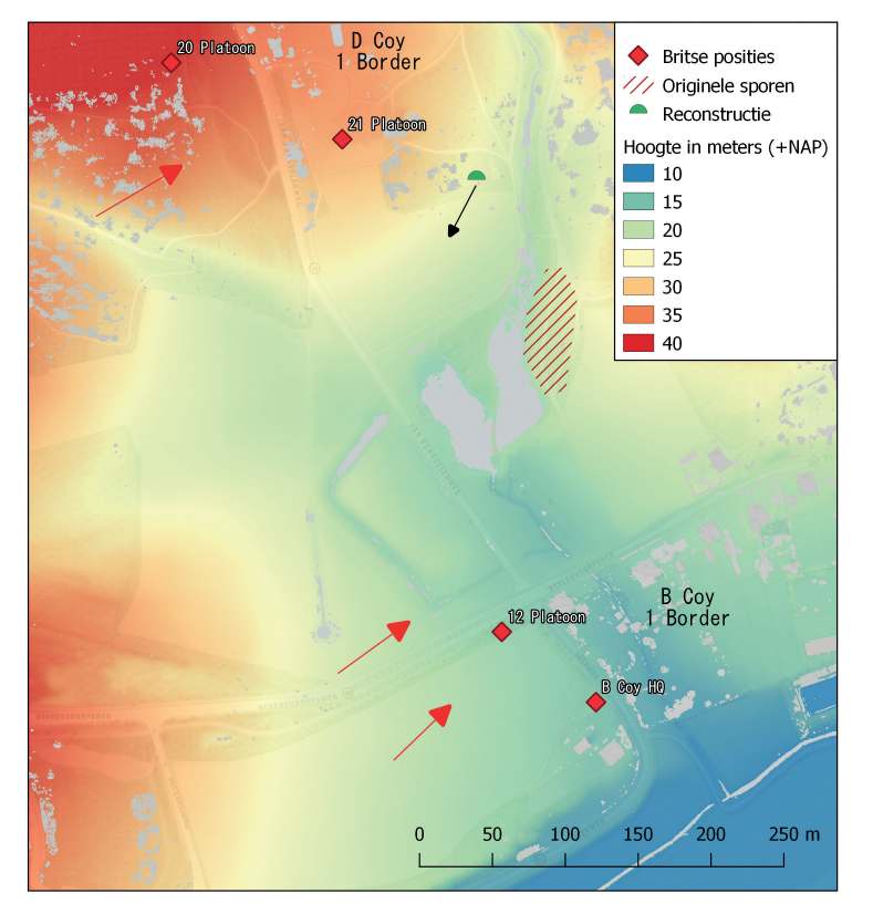 De locaties van de diverse pelotons van B en D Coy 1 Border zijn echter vooral gebaseerd op geschreven bronnen en ooggetuigenverslagen. In dit licht is het belangrijk om te wijzen op de resten van de schutters- putten langs de Oorsprongbeek. Ze liggen niet op een locatie die uit andere bronnen bekend is als (Britse) stelling tijdens de slag om Arnhem. Het is dan ook opvallend dat ondanks dat de sporen nooit zijn verge- ten, ze niet eerder zijn vastgelegd.