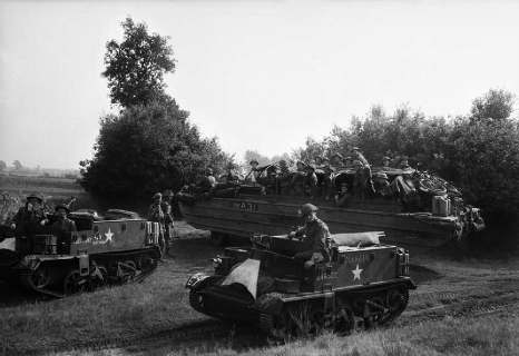 leiding en de harde praktijk, verloopt de actie voor het 18e Peloton redelijk voorspoedig. Nadat eind au- gustus de verovering van Normandië een feit is, gaat het noordwaarts. De 43. Division krijgt de order als eerste gevechtsformatie de Seine bij Vernonnet over te steken.