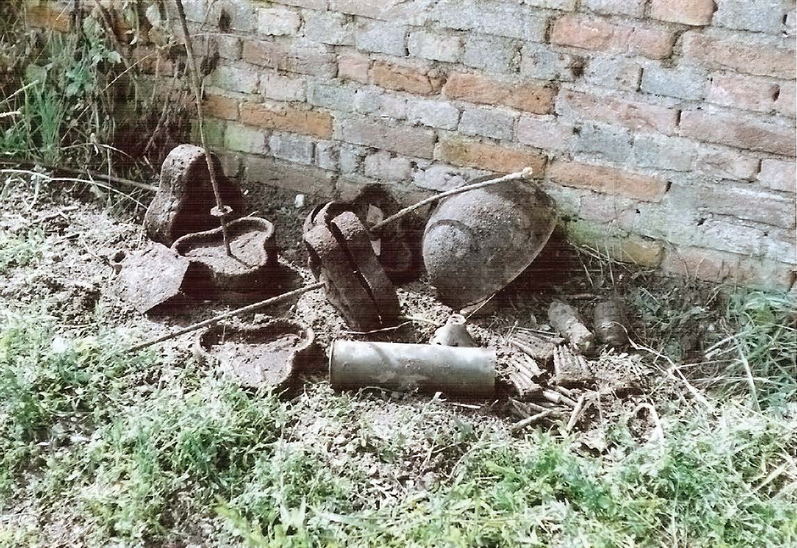 rek heeft verwijderd blijkt dat de bodem van de stelling bezaaid ligt met beugeltjes, die bedoeld waren voor de bescherming van de ontstekers van de 75mm granaten. Deze beugeltjes moesten worden verwijderd, voordat de granaten werden afgesteld en afgeschoten. Tevens liggen er het overblijfsel van een schede van een spijkerbajonet, een lepel en een dop van een tube tandpasta van het merk ‘Colgate’. De meest opmerkelijke vondsten zijn twee sleutels, die bestemd waren om de ontsteking van de granaten af te stellen. De sleutels zijn van het type Setter Fuse M14 en verkeren in een zeer goede staat. Ze zijn groen geverfd met daaroverheen een deel in rood, zodat ze goed opvallen. Zelfs de tekst is leesbaar. In de hoek van het weiland wordt nog een schuttersput getraceerd, waarin alleen .303-inch patronen en enkele tubes anti-gaszalf liggen. Later in de middag zoekt Hans met de ‘diepzoeker’ bij de muur, wat direct flinke uitslagen van de meter tot gevolg heeft. Na ongeveer 75 cm diep te hebben gegraven in het puin van de kerk, vindt Hans twee munitierekken van 75mm granaten, die in een goede staat verkeren. De aluminium plaatjes, waarin het type granaat is gestanst, zijn zo goed als nieuw. De laatste vondst van de dag is een handgranaat. Rond vijf uur wordt het zoeken beeindigd.