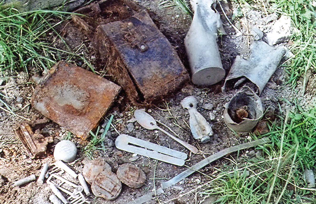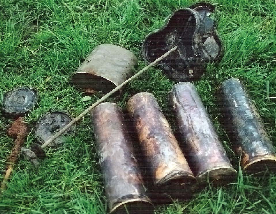 Hans zoekt verder bij de muur en vindt de overblijfselen van een munitiekist voor .303-Vickers patronen en een koelingreservoir, dat bij een Vickersmitrailleur hoorde. David is het weiland ingegaan en vindt een Britse handgranaat, een 2-inch mortiergranaat (rook) en een zogenaamde tondeldoos, een vooloper van het hedendaagse luciferdoosje. Deze tondeldoos dateert uit ongeveer het eind van de 19e eeuw.