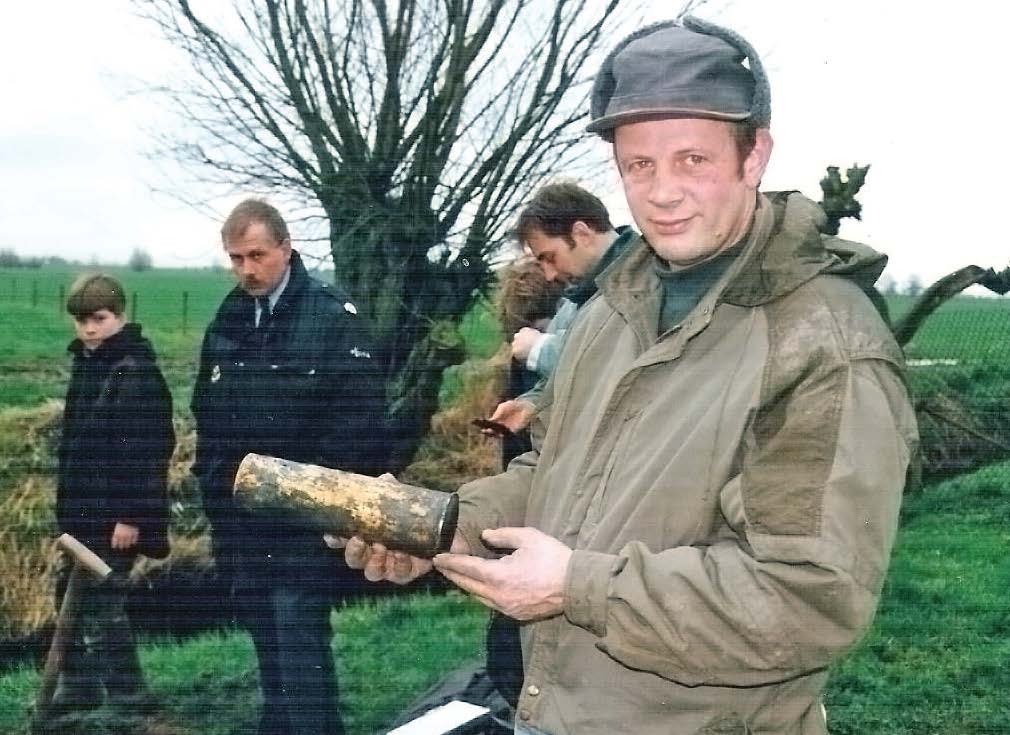 Dick Timmerman met een zojuist opgegraven 75mm huls