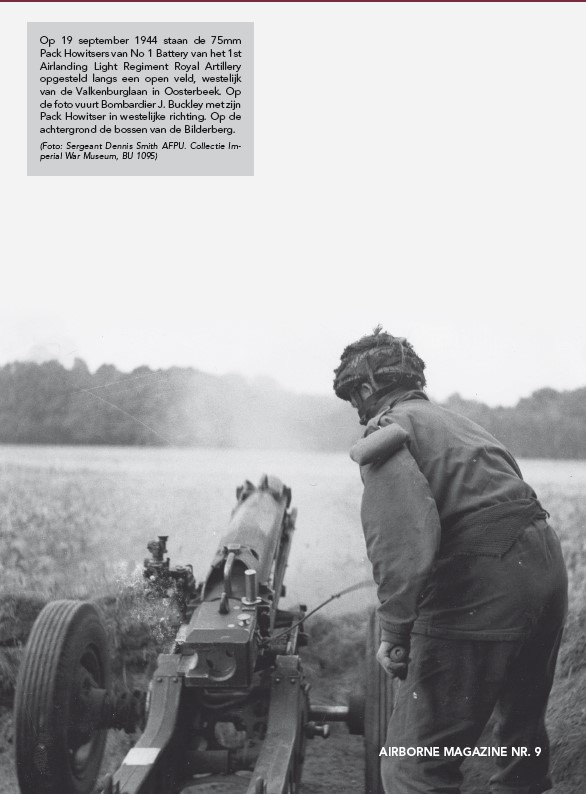 Omslag: Achter de Oude Kerk in Oosterbeek, waar in september 1944 de 75mm Pack Howitsers van ‘F’ Troop van het 1st Airlanding Light Regiment RA waren opgesteld, zette een re-enactment groep op 17 september 2016 opnieuw een kanon van dit type neer. Daarmee werd een aantal losse flodders afgevuurd, hetgeen een bijzonder spectaculair beeld opleverde. (Foto: Judith Minkman)