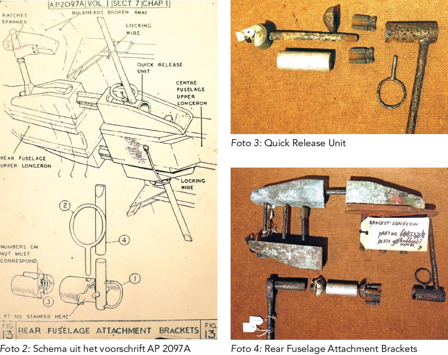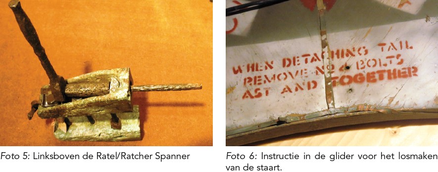 Het staartstuk zat op acht plaatsen met bouten aan de romp van de glider vast. Deze bevestigingen hadden de aanduiding ‘REAR FUSELAGE ATTACHMENT BRACKETS’. De tekeningen vinden we terug in het voorschrift AP 2097A, volume 1, Sectie 7, Hoofdstuk 1. (foto 2) Twee lange bouten (bolts) waren in een U-vormig aluminium huis onder en boven aan een lengtespant bevestigd. Ze staken door de spanten, die aan beide zijden aan de romp en staart tegen elkaar aan waren geplaatst (foto 4). Bij deze bouten zat aan de ene zijde een vaste kop, en aan de andere zijde een moer, die uit twee gelijk genummerde helften bestond. Deze werden bijeen gehouden door een bus met haaks daarop een steel. (quick release unit), (foto 3). Van deze quick release units zijn in de afgelopen jaren vele tientallen op de landingsterreinen bij Wolfheze gevonden. De unit werd op zijn plaats gehouden door een borgpen en extra met een borgdraad (locking wire) vastgemaakt. Aan de andere zijde werden de bouten aangedraaid met een ratel (ratchet spanner) (foto 5). Deze werd vervolgens met een leren bandje vastgezet.De staart zat zo voldoende vast aan de glider. Om nu de staart los te koppelen moesten alle bussen van de uit twee helften bestaande moeren afgeschoven worden, waarna de moerenschalen uiteen vielen. De bouten zaten nu niet meer vast en de gehele staart kon naar achteren geschoven worden. De bevestigingsbouten waren genummerd, waarbij de no’s 4 bovenin de glider als laatste tegelijk losgemaakt moesten worden. Een tekst op het spant in de glider gaf dan ook aan: “Remove no. 4 bolts last and together” (zie foto 6). Als er een te grote trekspanning op de bouten stond kon de bus vaak niet meer van de moerschalen (twee halve moeren) afgeschoven worden. Dit was veelal het gevolg van een zware landing. Het alternatief was dan de houten spanten stuk te hakken. Vervolgens moesten de verschillende draden die naar het staartstuk liepen doorgeknipt worden. Hiervoor zat er ook een draadtang bij de glider. Nadat de metalen uitrij-goten aangebracht waren kon het uitladen beginnen. Deze constructie, samengesteld uit gevonden glideronderdelen afkomstig van de landingsterrei-
