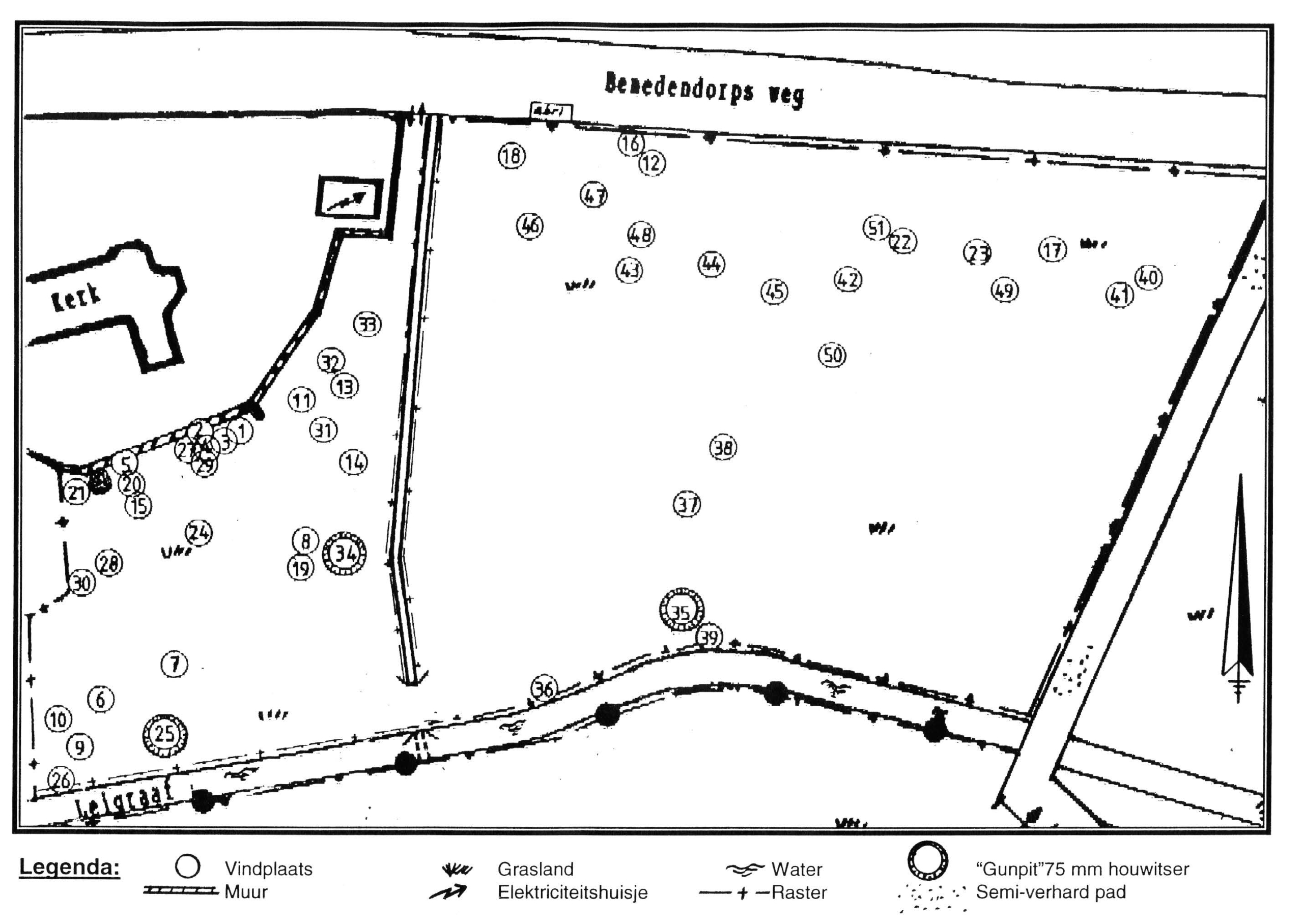 Verkleinde kaart van het onderzoeksgebied bij de Oude Kerk in Oosterbeek met alle lokaties waar vondsten werden gedaan. Deze lokaties zijn voorzien van een nummer dat correspondeert met de nummers op een lange lijst in het originele rapport, waarop tot in detail alle vondsten zijn vermeld.