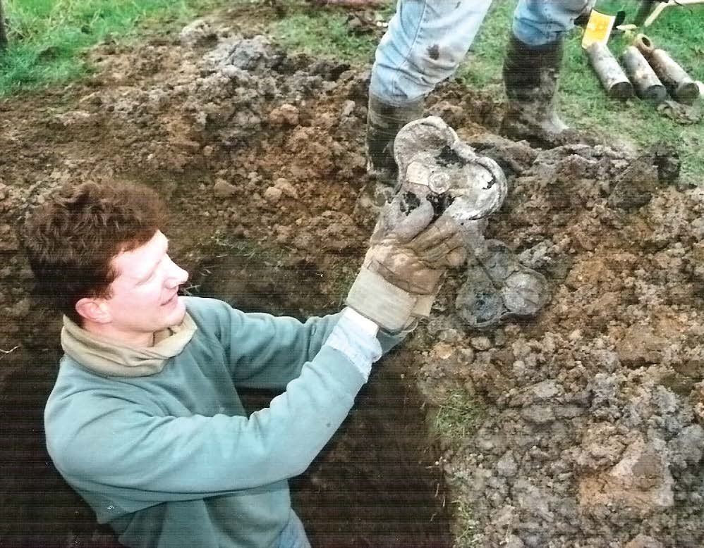 Hans Timmerman met een zojuist opgegraven rek voor drie 75mm granaten.