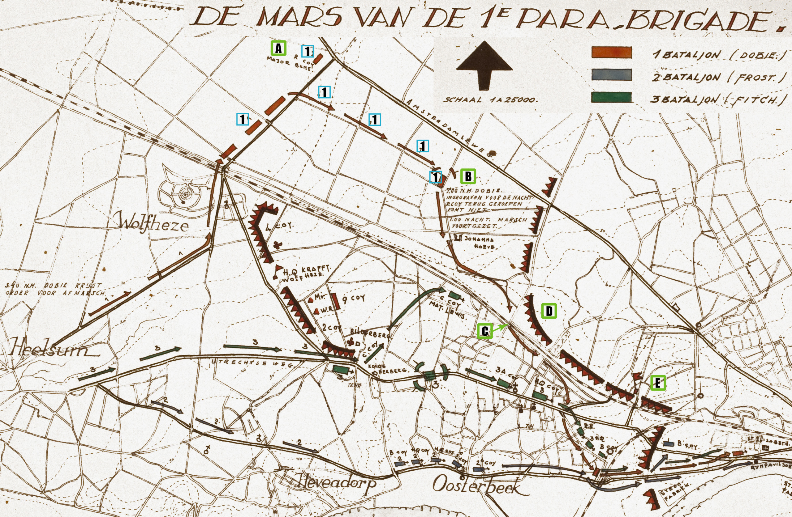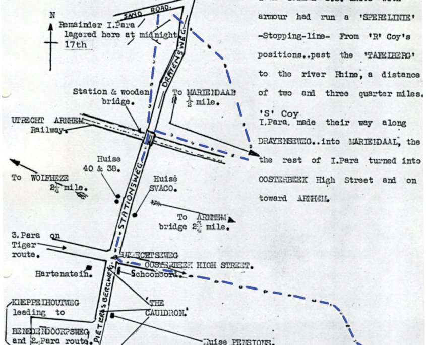 Als iets kenmerkend is voor de geschiedschrijving van Market Garden, dan is het wel de gedetailleerdheid van de beschikbare bronnen. Helaas geldt dit niet voor de bewegingen van 1st Parachute Battalion tijdens de eer-ste donkere uren van de slag. Simpelweg omdat in het war diary van de gevechtseenheid heel weinig is opge-nomen over die cruciale nacht. Voordat ik dieper in ga op het ontkrachten van de constatering dat de over-steek ten westen van Osterbeek plaatsvond (bij coör-dinaten 689796, zoals in ABM 14 uiteengezet), kijken we eerst maar eens naar de landing van 1st Bn.