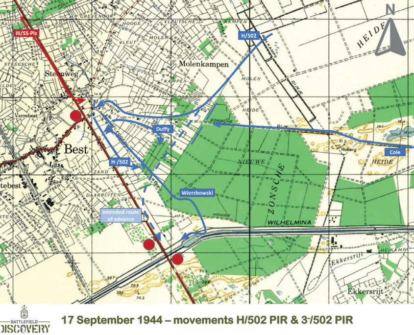 manding Officer 502 PIR, besluit 2/502 onder Lieu-tenant Colonel Chappuis ter versterking naar voren te sturen. Chappuis’ bataljon moet het terrein voor Cole vanuit noordelijke richting schoonvegen en Best en de bruggen innemen. Cole’s bataljon fungeert daarbij feitelijk als scharnierpunt.