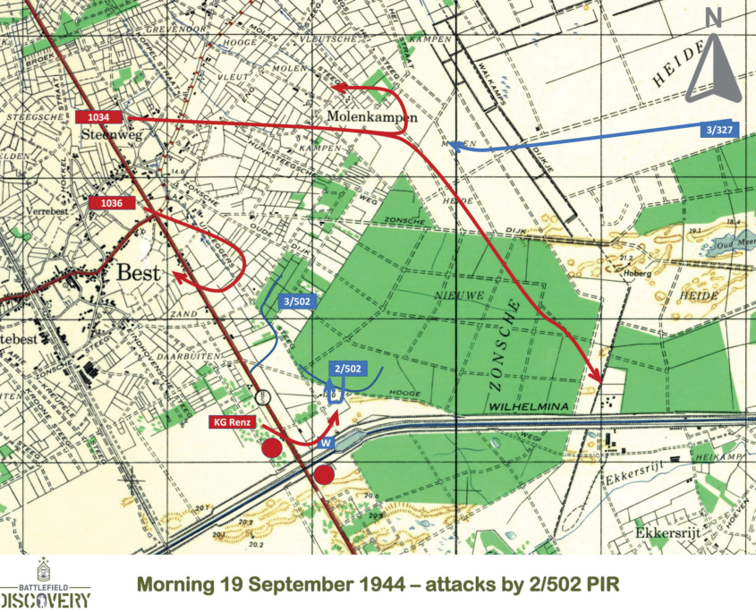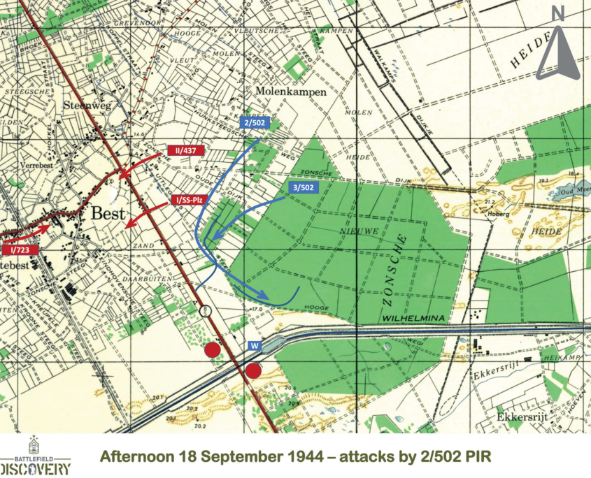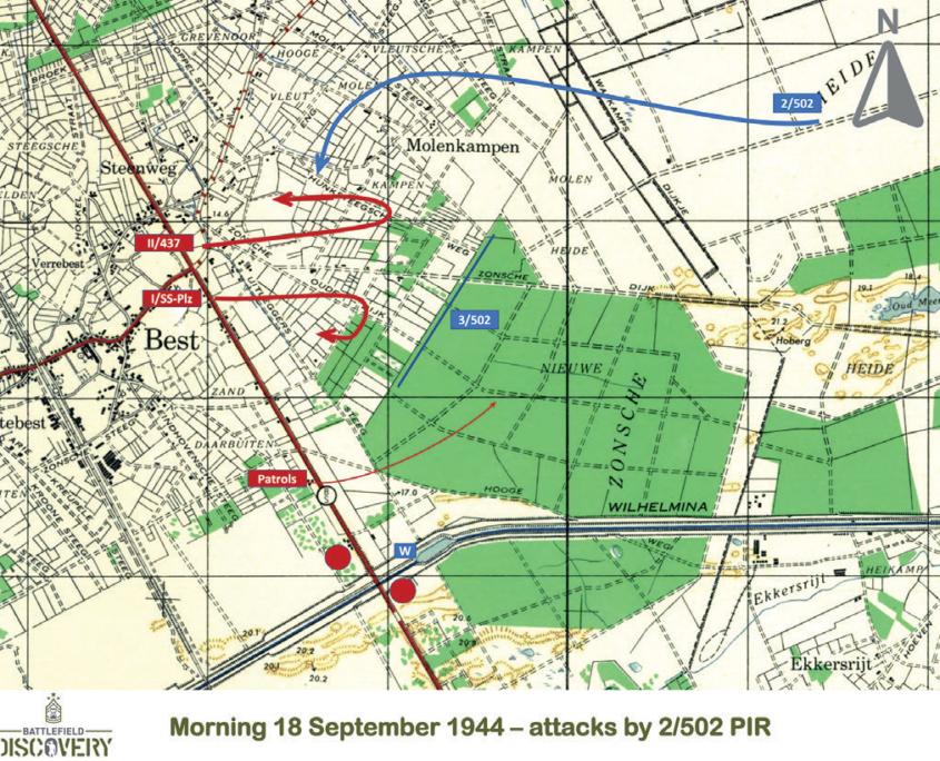 Op 17 september 1944 vanaf 14.00u landen de drie parachutistenregimenten van de 101st Airborne Divi-sion op drie plekken.2 501 PIR komt noord en zuid van de Zuid-Willemsvaart bij Veghel aan de grond om de vier bruggen daar te veroveren. 502 en 506 PIR landen op de Sonse Heide. 506 PIR trekt naar Son om de bruggen in te nemen en door te stoten naar Eindhoven. 1st Battalion 502 PIR (1/502) gaat naar Sint-Oedenrode en het 2nd Battalion (2/502) blijft ter beveiliging op het landingsterrein. Het versterkte H/502 trekt naar de bruggen bij Best, terwijl de rest van 3/502 in divisiereserve zou gaan bij Son.