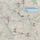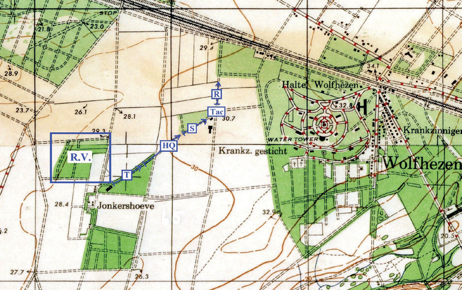 Kaart 1. Het bataljon kreeg de opdracht te vertrekken om 15.40u. Deze kaart laat zien hoe uitgestrekt een pa-rachutistenbataljon kan zijn bij verplaatsing in een ko-lom: zo’n 1000 meter. R Company vormde de spits, met net daarachter het Tactical HQ van de bataljonscom-mandant, gevolgd door S Company, Battalion Main HQ, HQ Company (met de Support-Weapons Group, minus detachementen), de aan het bataljon toegevoegde eenheden en T Company in de achterhoede.