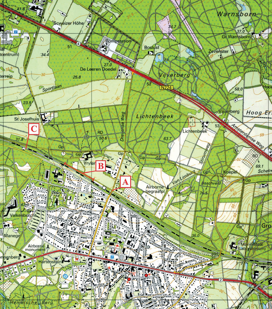 Kaart 2. De kaart toont de mogelijke oversteek-plaatsen die sinds 1944 zijn genoemd: [A] De spoor-wegovergang in Oosterbeek. [B] Een gebied tussen 300 en 800 meter van station Oosterbeek. [C] Een oversteekplek voor spoorwegwerkers/lorrie-uitzet-plek (zie Ministory 130, Airborne Magazine nr. 14).