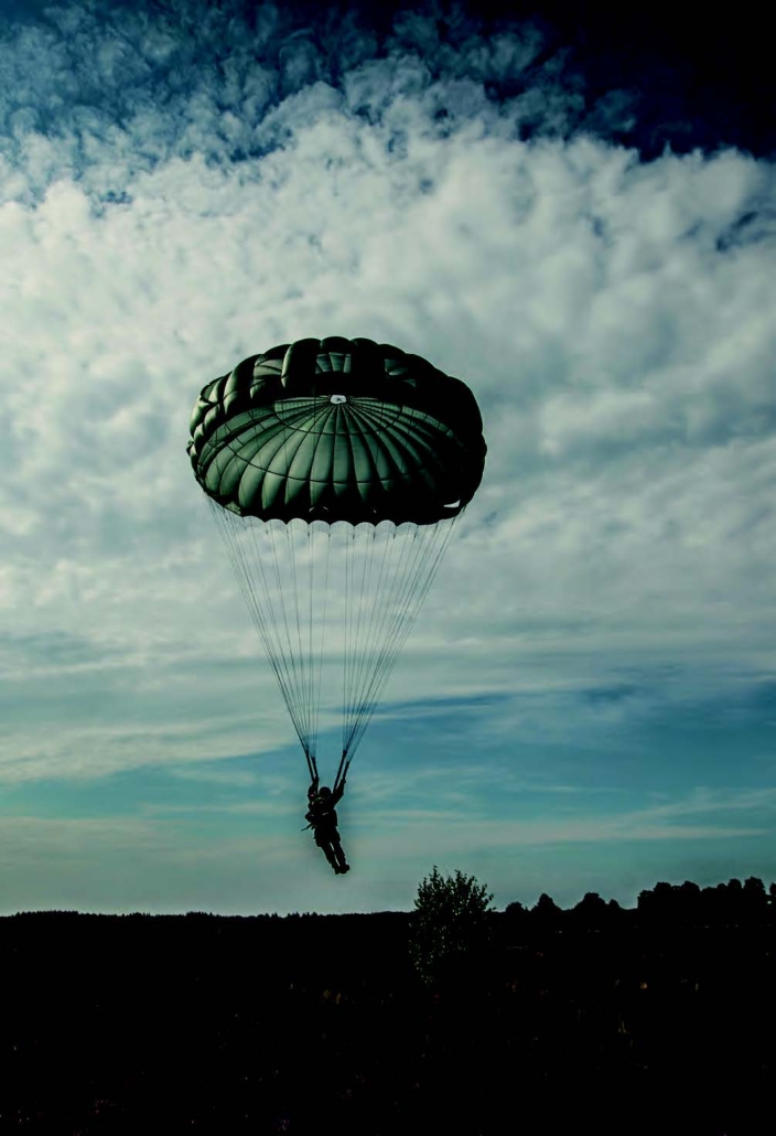 September 2021. Een parachutist van de Luchtmobiele Brigade landt op het Houtdorperveld bij Garderen tijdens ‘Falcon Leap’, de grootschalige internationale oefening die samenviel met de herdenking van operatie Market-Garden (foto: 11 Luchtmobiele Brigade).