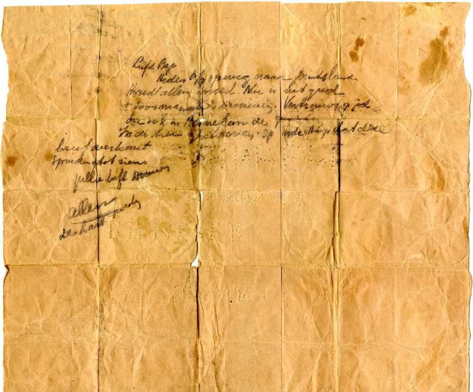 Vertrouwt op God. […] In de trein geschreven in de hoop dat deze brief overkomt. Spoedig tot ziens.”