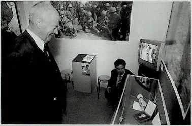 FOTO: BERRY DE REUS, 1 juni 2006. Onder het toeziend oog van Michael Sosabowski legt Frans Smolders de Bronzen Leeuw van generaal Stanislaw Sosabowski in een vitrine van het Airborne Museum.
