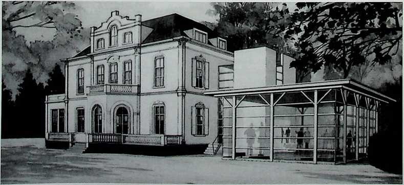 FOTO: COLLECTIE AIRBORNE MUSEUM, Schetstekening van het nieuwe Airborne Museum. Rechts het glazen entreegebouui met lift en trappen, dat aan de westzijde van Hartenstein zal worden gebouwd.