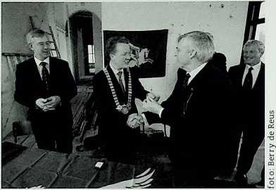Met een handdruk bezegelen de burgemeester van Renkum, de heer Gebben (midden), en de voorzitter van de Stichting Airborne Museum, de heer Heij, de overdracht van de villa Hartenstein. Links Paul Tirion, de bouwcoördinator (19 december 2008)
