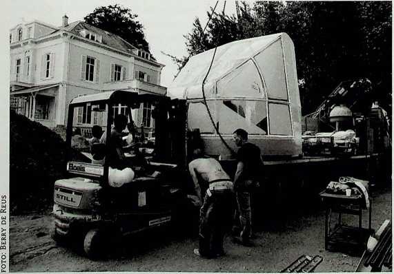 Voor de ‘Airborne Experience, September 1944’ is een deel van een HORSA glider nagebouwd. De foto toont het moment dat de cockpit bij het Airborne Museum wordt afgeleverd.