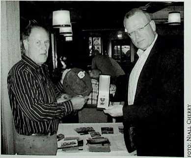 Bij het begin van het weekend voor leden uit het Verenigd Koninkrijk, op vrijdagavond 26 juni, overhandigt Mr. lan Walker (links) de baret en een onderscheidingsteken van zijn oom, L/Cpl Lambie, aan Ben Kolster, voorzitter van de VVAM. L/Cpl Lambie diende in september 1944 bij 7KOSB. Deze persoonlijke bezittingen zijn inmiddels overgedragen aan het Airborne Museum.