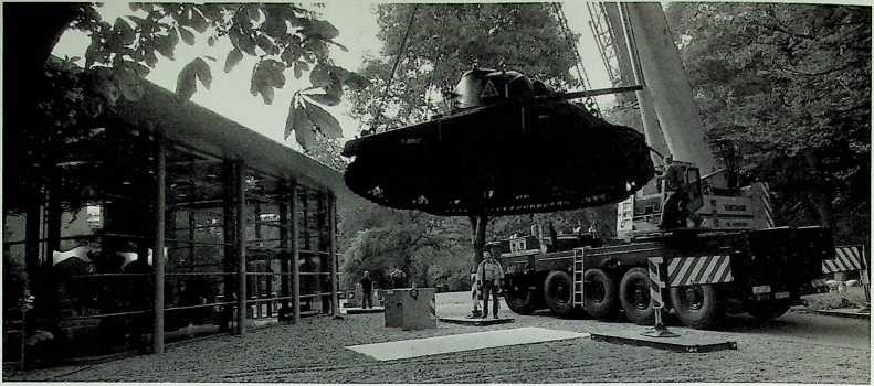De Canadese Sherman tank, die tot voor kort aan de oostzijde van het museum stond, is begin september door een grote kraan neergezet naast het nieuwe ingangsgebouw van het Airborne Museum. FOTO: BERRY DE REUS