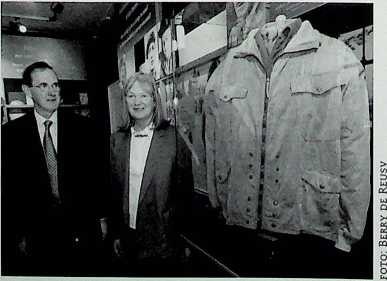 Adam en Judith Urquhart bij de smock, die hun vader, generaal-majoor R.E. Urquhart, droeg tijdens de Slag om Arnhem.