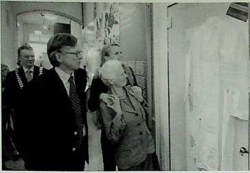 De witte jas die dokter Randall Martin in september 1944 droeg in de verbandpost, die was gevestigd in Huize ter Horst in Oosterbeek werd op 17 september jl. door Sophie Lambrechtsen-ter Horst overgedragen aan het Airborne Museum. Links naast Sophie, haar broer Kees en links op de achtergrond burgemeester Gebben.