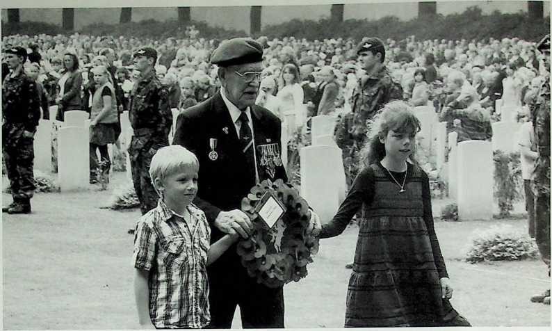 Tijdens de afgelopen herdenkingsdienst op de Airborne Begraafplaats legt Frank Newhouse samen met twee Nederlandse kinderen een krans bij het Cross of Sacrifice, FOTO: JAN PIJPERS