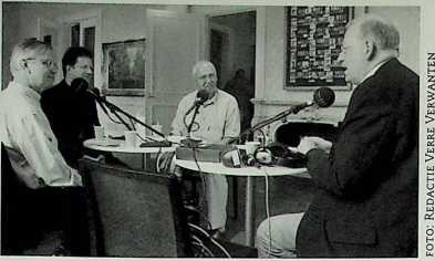 Tijdens de radio-uitzending van Verre Verwanten praat Ben Kolster in het Airborne Museum met (v.l.n.r.) Robert Voskuil, Hans Timmerman en Wybo Boersma.