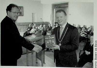 Tijdens een bijeenkomst in het gemeentehuis in Oosterbeek op 2 september overhandigt Journalist Laurens van Aggelen (links) Burgemeester Gebben van Renkum het eerste exemplaar van zijn boek ‘Airborne