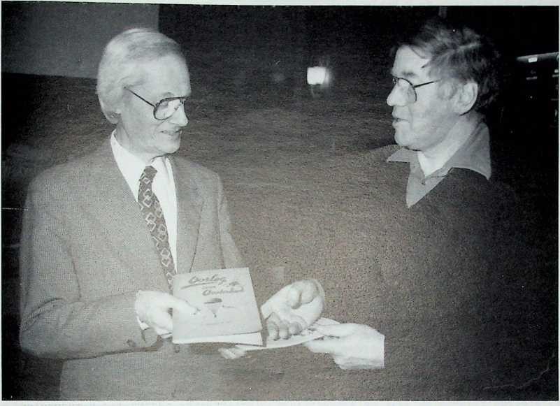 De heer Pit overhandigt een gesigneerd exemplaar van zijn boekje “Oorlog over Oosterbeek” aan Drs.A.Groeneweg van het bestuur van de Stichting Airborne Museum, (foto: B.de Reus)