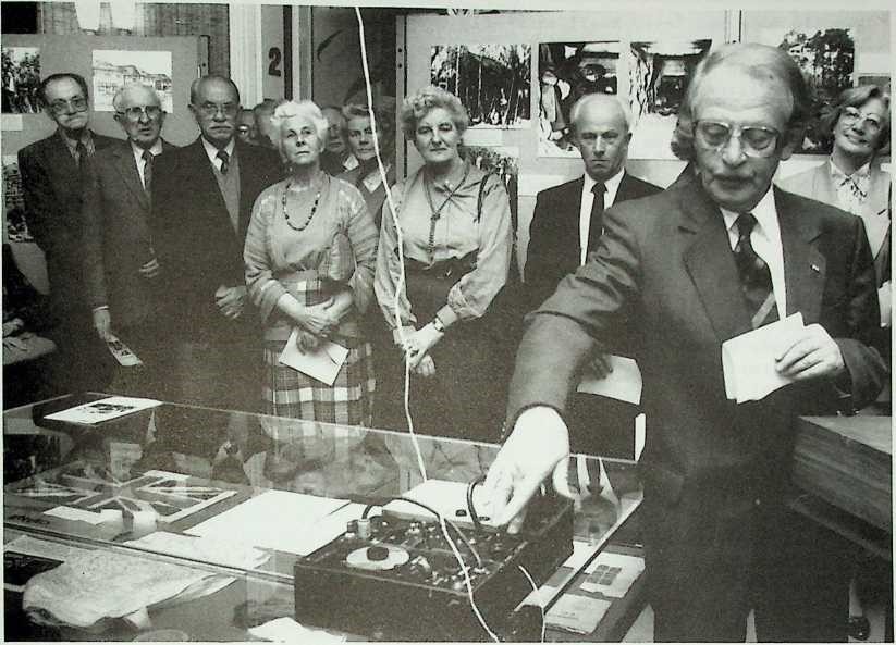 Met een druk op de knop van een oude zend-ontvanger opent de heer Nieuwstraten de tentoonstelling “Het Verzet en de Slag om Arnhem”; (Foto: B.de Reus)