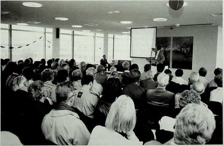 Jubileum excursie 1990. Voor een aandachtig gehoor geeft de archivaris van de gemeente Arnhem, drs.P.R.A.van Iddekinge, uitleg over de strijd die in september 1944 woedde rond de Rijnbrug in Arnhem. (Foto: B.de Reus)