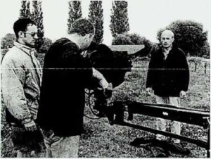 Professor Richard Holmes voor de camera in het weiland bij de Oude Kerk te Oosterbeek, tijdens de opnamen voor de BBC-docnmentaire over Operatie Market Garden. (foto: Roberl Voskuil)