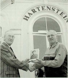 37 maart 2002. Peter Wilkinson (links) draagt een aantal persoonlijke bezittingen van de op 27 februari jl. overleden Dennis Munford over aan de directeur van het Airborne Museum, de heer W. Boersma.