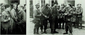 Rechter foto: De Poolse luitenant-kolonel Martin Roller, die bij Oosterbeek gevangen werd genomen, in gesprek met een aantal Duitse militairen. Is dit voor hetzelfde pand als waar Dave Morris werd gefotografeerd?