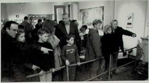 Social Evening, 13 Februari 2004. Ouders wijzen hun kinderen op de maquette in het Airborne Museum de plaatsen aan, die een belangrijke rol hebben gespeeld bij de Slag om Armhem. In het midden onze voorzitter Ben Kolster.